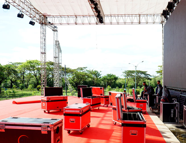 Kami menyewakan berbagai produk pendukung event anda. Panggung rigging, genset, AC, Sound system, lighting, dsb.